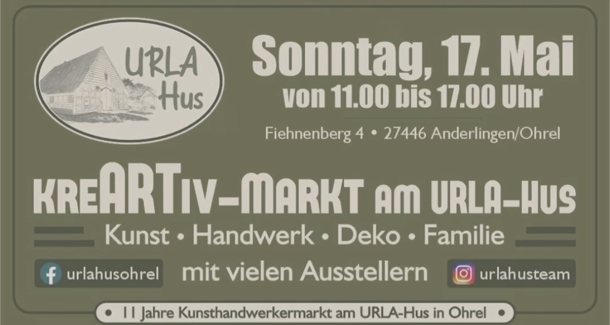 Urla Hus Fiehnenberg 4, Anderlingen-OhrelAm 17. Mai 2026 findet am URLA Hus wieder der beliebte KreARTiv-Markt statt! Von 11:00 bis 17:00 Uhr verwandelt sich
