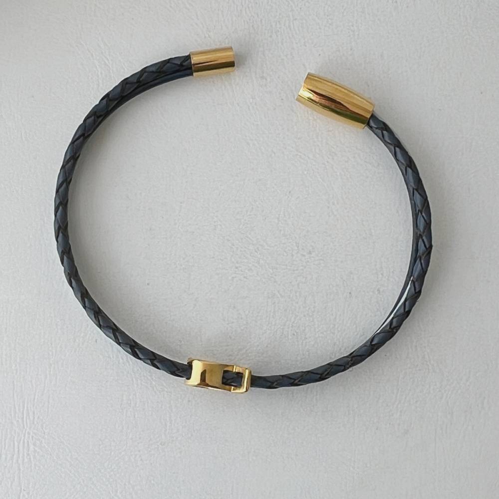 Es besteht aus einem 2,5 mm geflochtenem Lederband in den Farben schwarz oder blau sowie zwei farblich dazu abgestimmten feinen Lederbändern. Die Farben harmonieren sehr schön zusammen und lassen sich prima kombinieren. Geschlossen wird es mit einem hochwertigen Magnetverschluss aus mattierten gelbgoldfarbenen Edelstahl.