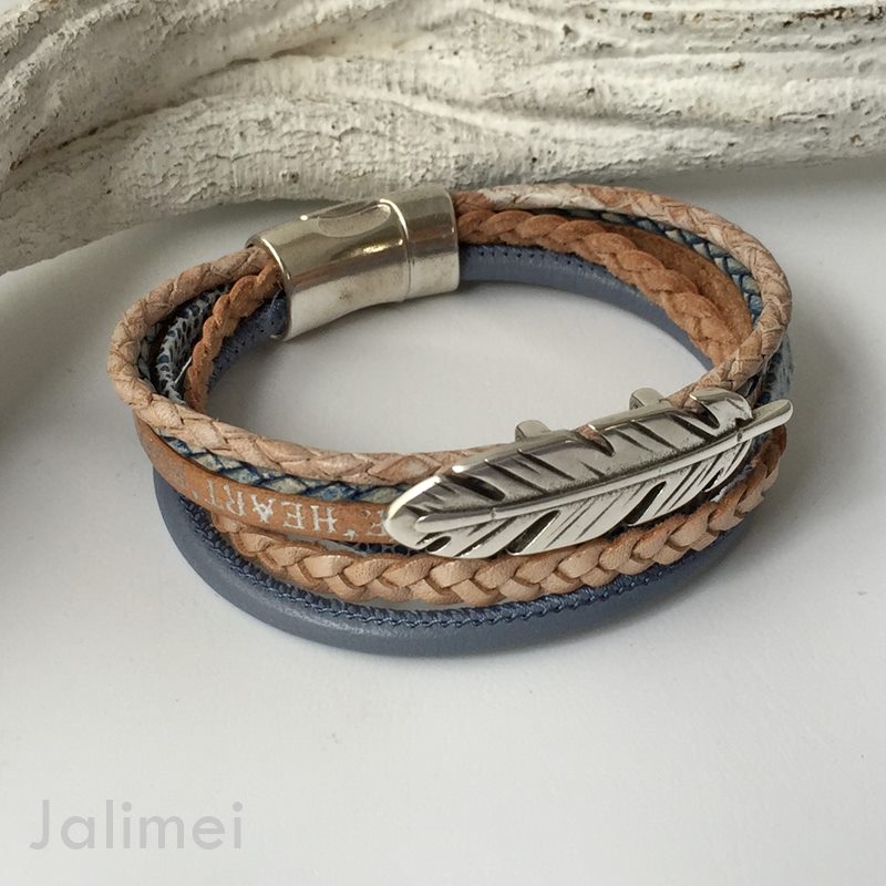 Armband bestehend aus 6 verschiedenen Lederbändern in hellblau und beige. Aufgepeppt ist es mit einem schönen Metallschieber Feder und wird mit einem Magnetverschluß geschlossen.