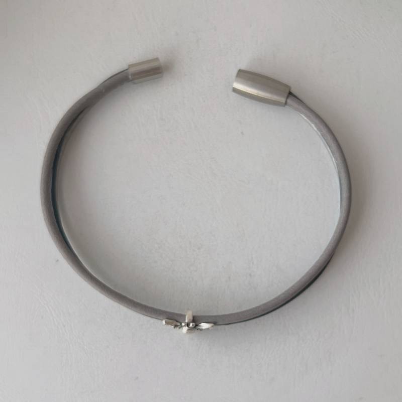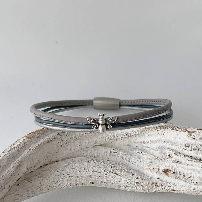 Verarbeitet ist ein hellgraues Nappalederband (ca. 2,5 mm) sowie zwei feine Lederbändchen (je ca. 1,5 mm) in Grautönen. Die kleine Biene hält die Bänder zusammen.