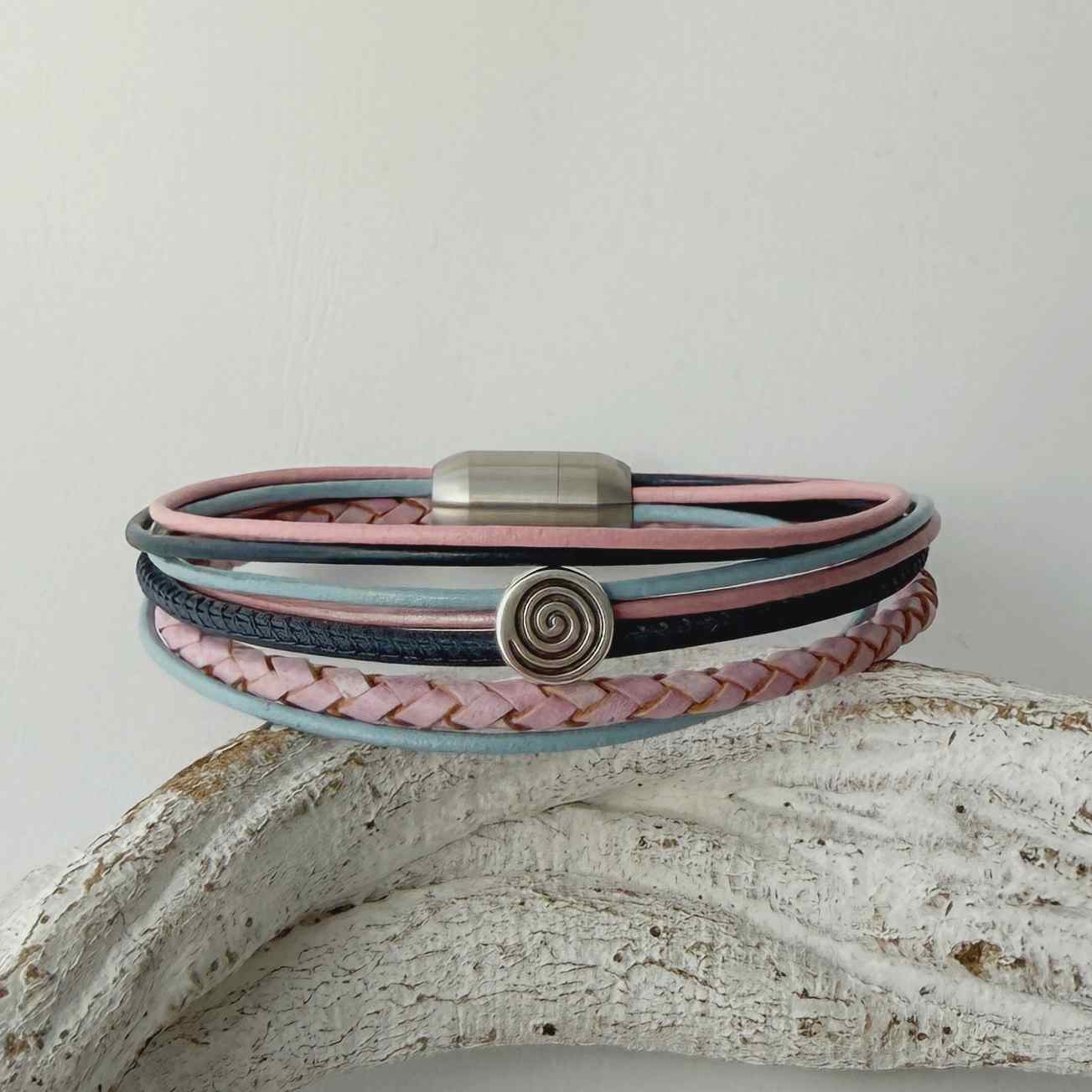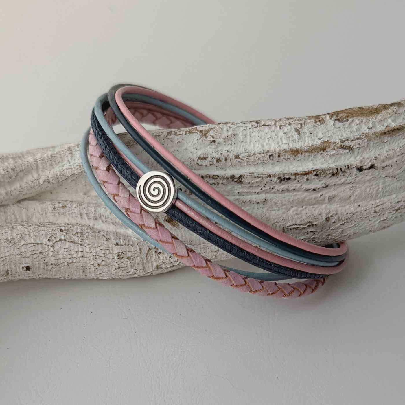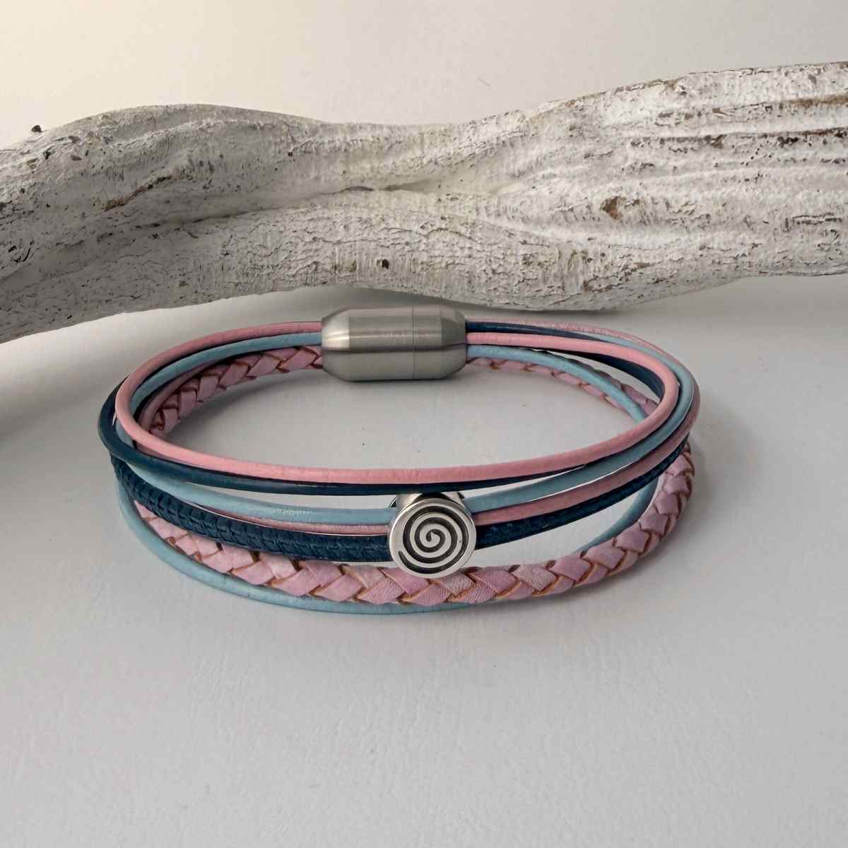 Verarbeitet sind ein Nappalederband (ca. 2,5 mm) in rauchblau, ein rosa geflochtenes Lederband (ca. 2,5 mm) und 5 dazu farblich abgestimmte Lederbänder (je ca. 1,5 mm). Aufgepeppt ist das Armband mit einer kleinen Spirale (ca. 8 mm), das einige Bänder zusammenfasst.