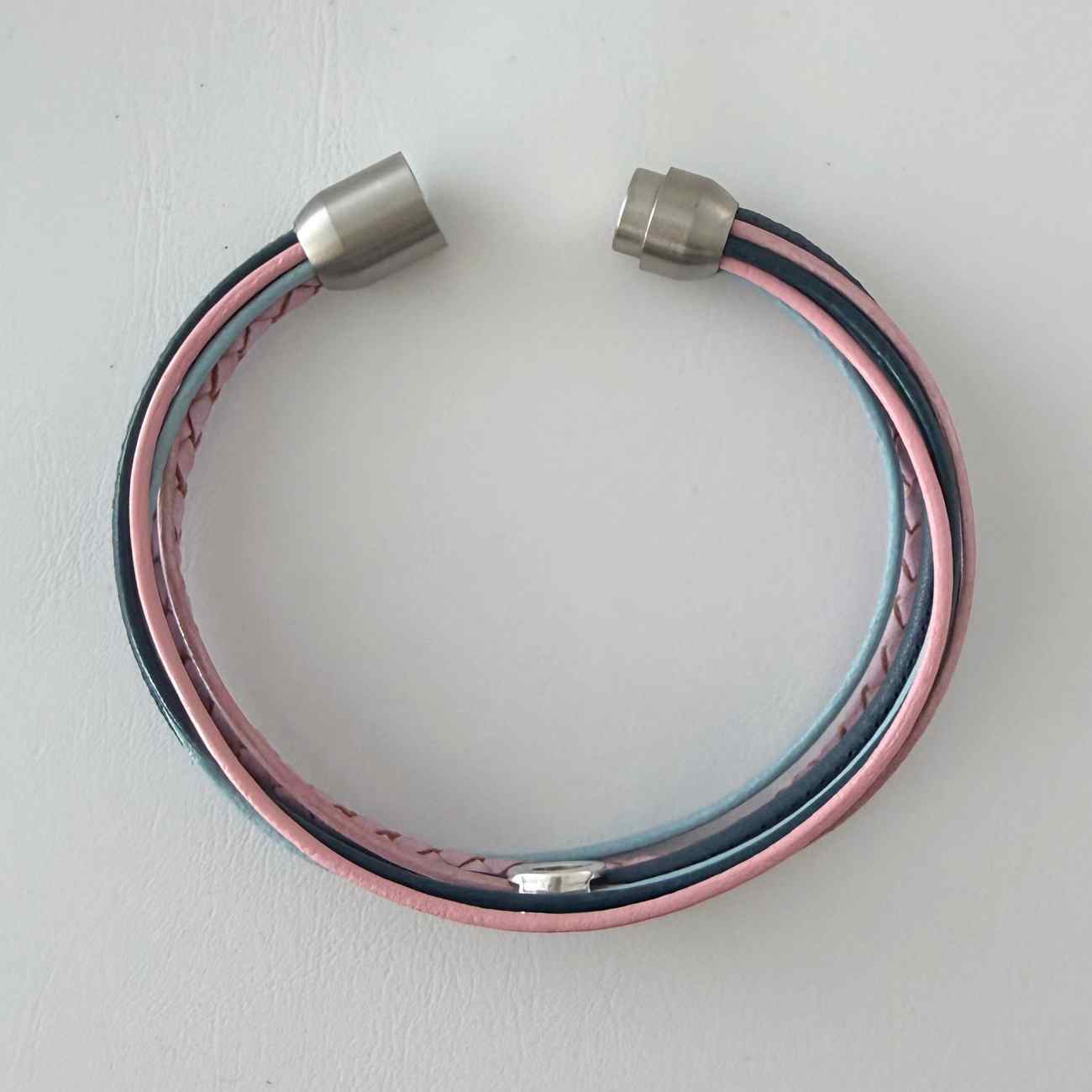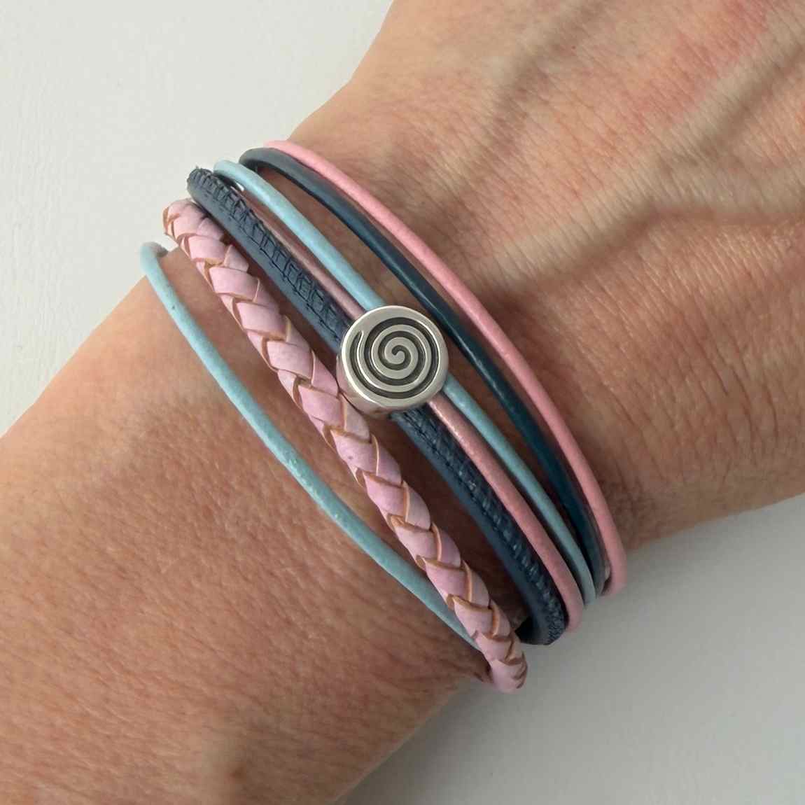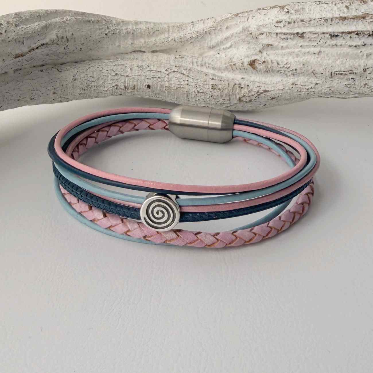 Verarbeitet sind ein Nappalederband (ca. 2,5 mm) in rauchblau, ein rosa geflochtenes Lederband (ca. 2,5 mm) und 5 dazu farblich abgestimmte Lederbänder (je ca. 1,5 mm). Aufgepeppt ist das Armband mit einer kleinen Spirale (ca. 8 mm), das einige Bänder zusammenfasst.