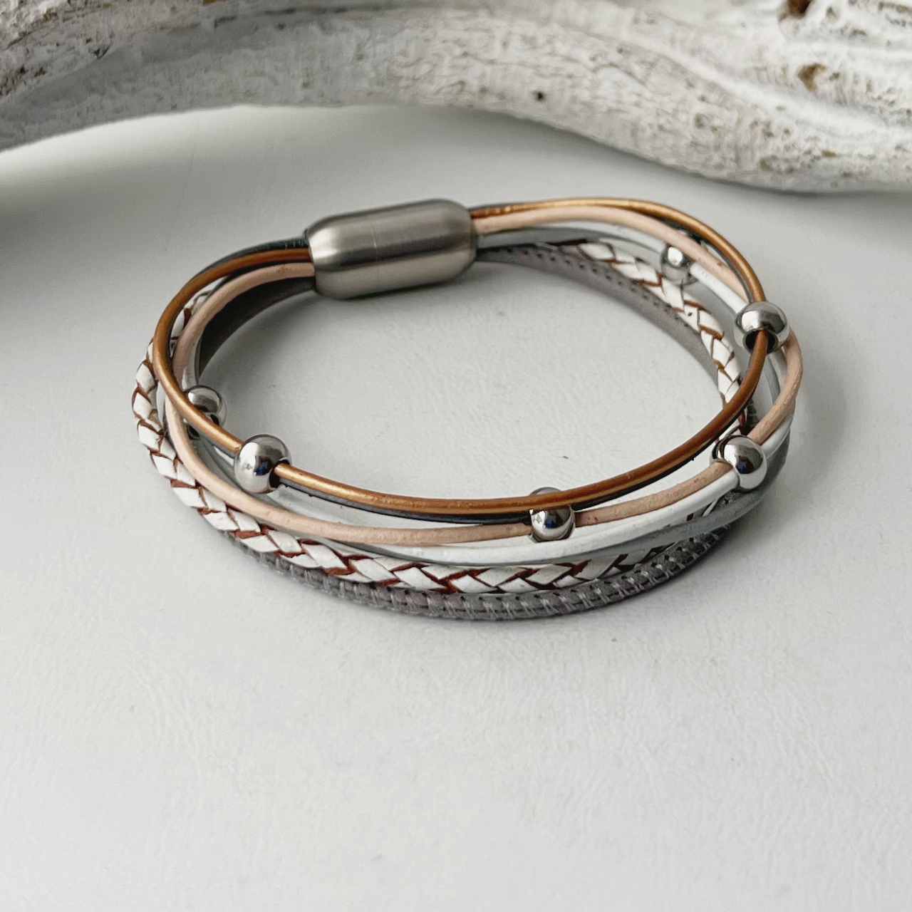 Das Lederarmband Nappa weiß-grau-bronze ist neutral und zugleich frisch in den Farben!
