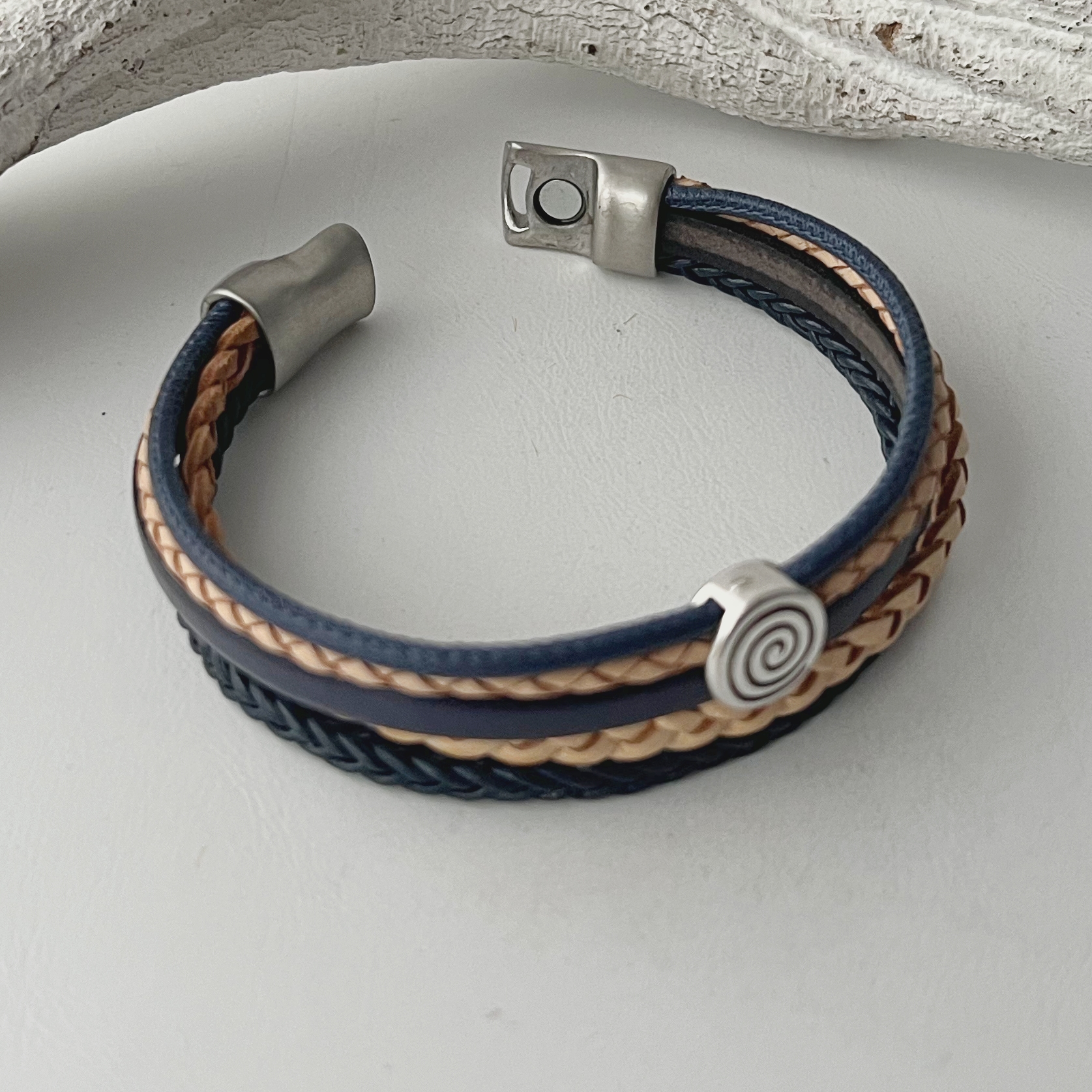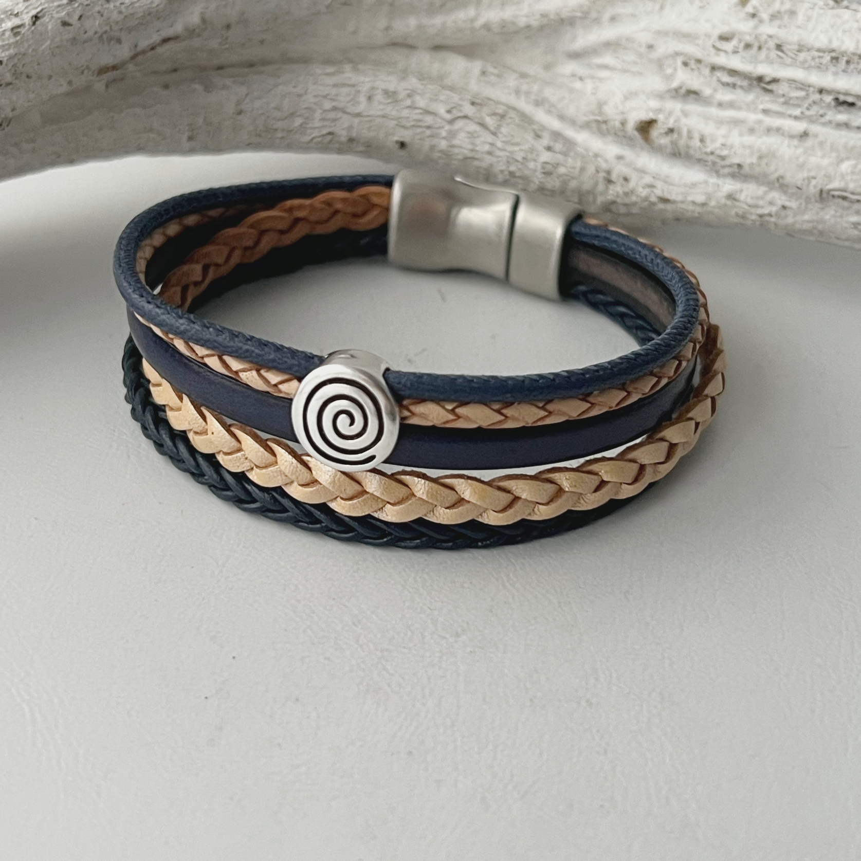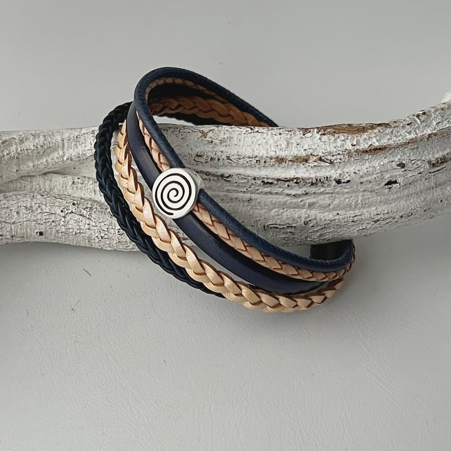 Lederarmband Spirale blau beige