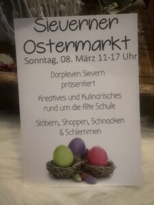 Kreatives und Kulinarisches „Ausschließlich handgemacht“ ist die Devise, nach der die Kunsthandwerker für die Sieverner Märkte ausgewählt werden. Ein vielfältiges Angebot von altbekannten und neuen Ausstellern kommt nach 3 Jahren Pause endlich wieder zum Ostermarkt von 11-17 Uhr rund um die Alte Schule Sievern zusammen. Papier- und Holzarbeiten, Schmiedekunst, Fotokarten, Schmuck, Floristik und vieles mehr bieten die Aussteller an. Außerdem gibt es regionalen Kaffee, Eierlikör, Honig, Königsberger Marzipan, Olivenöl, Brot und leckere Marmeladen für zu Hause. Bratwurst, Suppe sowie Butterkuchen…